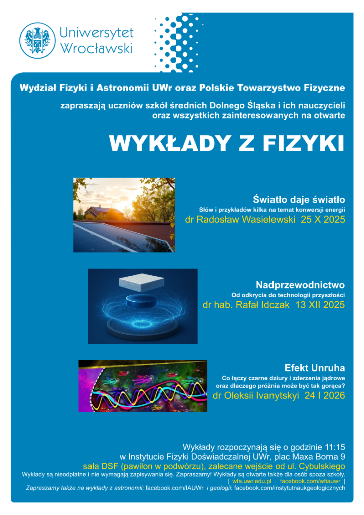 Dla kogo? Uczniowie szkół średnich, nauczyciele, inne osoby zainteresowane fizyką – to są wykłady otwarte