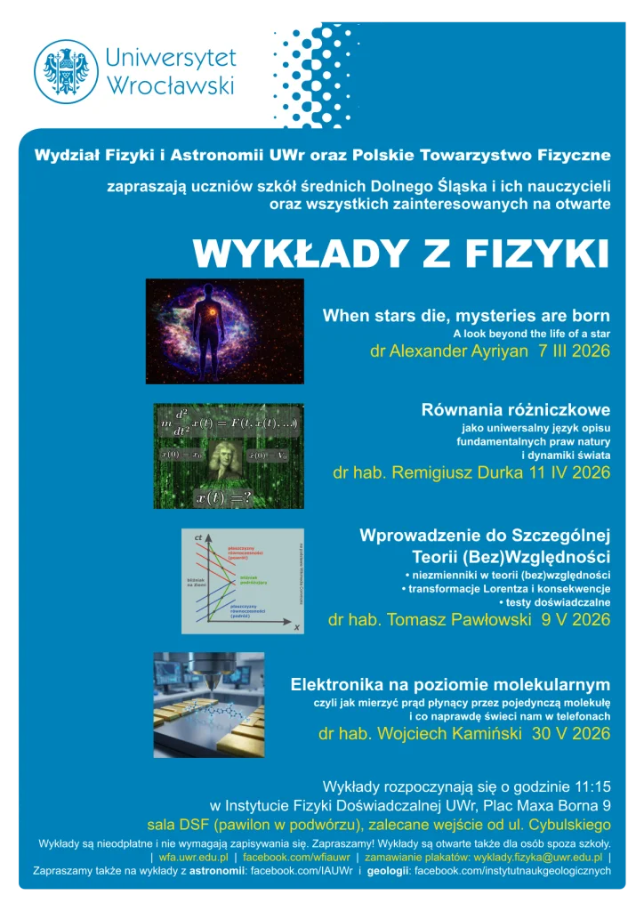 Gdzie? Wydział Fizyki i Astronomii Uniwersytetu Wrocławskiego, Plac Maksa Borna 9, sala 60 im. Jana Rzewuskiego (rotunda) albo sala DSF (pawilon w podwórzu) – proszę śledzić informacje na FB lub na plakatach.